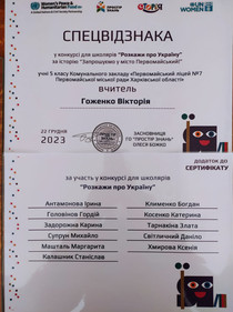 Вітаємо Білаш Дарину, ученицю 10-А класу та її вчителя історії Білаш Тетяну Олексіївну з І місцем у ІІІ (обласному) етапі Всеукраїнському конкурсі учнівської творчості у 2022/2023 н.р.